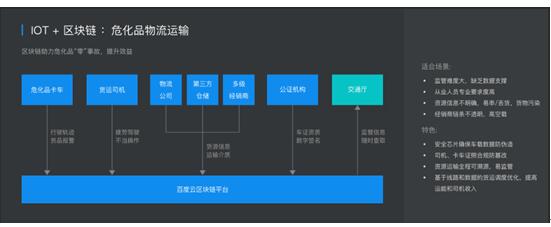 另外百度云在物流行業(yè)也有深度布局,以?;返倪\(yùn)輸為例,此行業(yè)對(duì)從業(yè)人員專業(yè)要求度較高,也存在資源信息不明確、丟貨引發(fā)貨物污染,經(jīng)銷商鏈條信息不透明,居高不下的空載率也在無(wú)形中添加了企業(yè)的成本負(fù)擔(dān)。在物流公司的合作中,通過(guò)接入百度云區(qū)塊鏈平臺(tái),可以回溯貨物運(yùn)輸鏈條的每一個(gè)環(huán)節(jié),諸如危化品卡車行駛軌跡、貨運(yùn)司機(jī)不當(dāng)操作、公證機(jī)構(gòu)的車證機(jī)制及數(shù)字簽名、交通廳監(jiān)管信息等等,從而做到資源運(yùn)輸全程的監(jiān)管可控,同時(shí),基于線路和數(shù)據(jù)的貨運(yùn)調(diào)度優(yōu)化,也可以提高企業(yè)運(yùn)營(yíng)效率和員工收入。