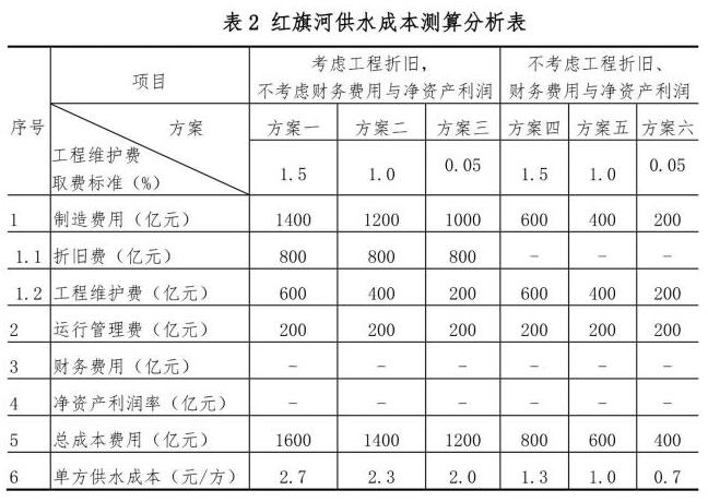 因此,紅旗河未來運(yùn)行成本不應(yīng)考慮工程折舊,不承擔(dān)財(cái)務(wù)費(fèi)用,不計(jì)提資本金利潤,僅包括工程維護(hù)費(fèi)和運(yùn)行管理費(fèi)。根據(jù)《水利建設(shè)項(xiàng)目經(jīng)濟(jì)評(píng)價(jià)規(guī)范(SL 72-2013)》,大型混凝土輸水工程折舊期為50年,工程維護(hù)費(fèi)和運(yùn)行管理費(fèi)分別為固定資產(chǎn)原值(不包括占地淹沒補(bǔ)償費(fèi)用)的1.0-1.5%和0.5%,考慮紅旗河規(guī)模效應(yīng),其中工程維護(hù)費(fèi)設(shè)定取值1.5%、1.0%和0.5%三種方案,則每立方米調(diào)水成本約為0.7-1.3元。參考徑惠渠灌區(qū)、青銅峽灌區(qū)、河套灌區(qū)等我國西北地區(qū)自流灌區(qū)運(yùn)行成本,支渠以下每立方米灌溉成本均低于0.2元,若按每立方米0.2元取值,則紅旗河供水到用戶端的綜合成本約為每立方米0.9-1.5元,具體分析詳見表2??紤]未來受水區(qū)城市生活和工業(yè)水價(jià)將七八倍、甚至十倍于農(nóng)業(yè)水價(jià),共同分擔(dān)供水成本,預(yù)計(jì)農(nóng)業(yè)水價(jià)將低于0.5元/立方米,未來規(guī)模化開發(fā)的高附加值的現(xiàn)代節(jié)水農(nóng)業(yè),完全能夠承受這一價(jià)格。如果考慮航運(yùn)、發(fā)電等附帶效益進(jìn)一步分?jǐn)偣┧杀?,水價(jià)還會(huì)進(jìn)一步降低。#p#分頁標(biāo)題#e#