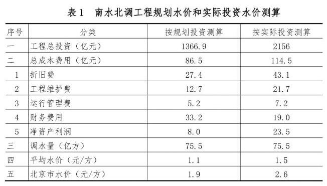 根據(jù)本世紀(jì)初編制的南水北調(diào)中線規(guī)劃,工程總投資1366.9億元,其中貸款683.5億元,其他投資來源為中央撥款以及南水北調(diào)基金。根據(jù)投資構(gòu)成,測(cè)算南水北調(diào)中線年總成本費(fèi)用為86.5億元,其中:工程折舊費(fèi)27.4億元、工程維護(hù)費(fèi)12.7億元、運(yùn)行管理費(fèi)5.2億元、利息等財(cái)務(wù)費(fèi)用33.2億元、凈資產(chǎn)利潤8億元。按凈調(diào)水量75.5億方計(jì)算,平均水價(jià)為1.1元/立方米。北京市為受水末端,需要承擔(dān)部分沿線渠道投資,考慮分?jǐn)偤?,總成本費(fèi)用為19.3億元,凈調(diào)水量為10億立方米,則北京市水價(jià)為1.9元/立方米。