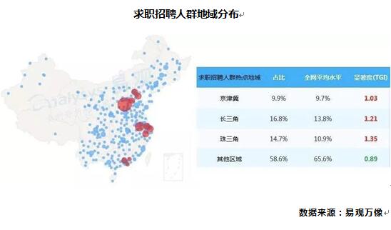 易觀萬(wàn)像顯示,一線城市及其周邊區(qū)域是求職招聘的需求集中地區(qū),其中京津冀、長(zhǎng)三角、珠三角為熱點(diǎn)區(qū)域,其顯著度(TGI)高于全網(wǎng)平均水平;求職招聘人群在這三個(gè)熱點(diǎn)區(qū)域的占比超40%。