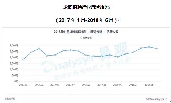 招聘行業(yè)一直流傳著金三銀四的說(shuō)法,從每年2月開(kāi)始,求職招聘行業(yè)都將迎來(lái)其旺季。易觀千帆數(shù)據(jù)顯示,2017年2月和2018年2月,求職招聘行業(yè)月活人數(shù),都有較為明顯的增長(zhǎng),隨即在5月恢復(fù)平穩(wěn)狀態(tài)。