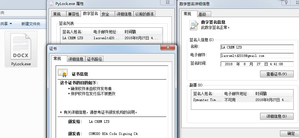 值得一提的是,以往很少有勒索病毒使用正規(guī)的數字簽名,而該勒索病毒擁有正規(guī)的數字簽名,簽名信息為LA CREM LTD。PyLocky勒索病毒借助合法證書,避免被安全軟件的查殺攔截,從而橫行網絡。勒索病毒入侵電腦后,將獲取機器信息,并隨機生成文件加密密鑰,用戶文件將被加密并擴展后綴為.lockedfile,若無私鑰無法解密,用戶需向不法黑客繳納贖金才能對文件進行解密。