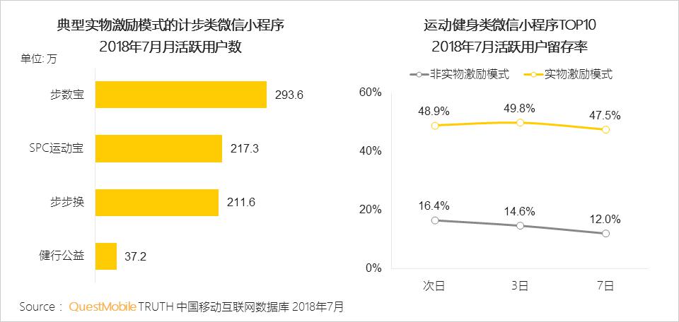QuestMobile數(shù)據(jù)顯示,以步數(shù)寶、SPC運(yùn)動寶等為代表的實(shí)物激勵模式的計(jì)步類微信小程序,用戶規(guī)模增長迅速,月活躍用戶數(shù)達(dá)百萬級。從活躍用戶留存率來看,實(shí)物激勵模式表現(xiàn)較優(yōu)。