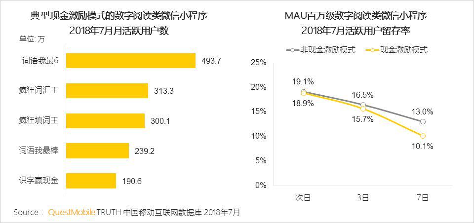 根據(jù)QuestMobile數(shù)據(jù),2018年7月月活躍用戶數(shù)在百萬以上的數(shù)字閱讀行業(yè)微信小程序共有34個,近一半都屬于利益驅(qū)動用戶增長模式,其中現(xiàn)金激勵模式的有12個,以詞語我最6、瘋狂詞匯王為代表的小程序月活躍用戶數(shù)均在百萬以上。#p#分頁標(biāo)題#e#