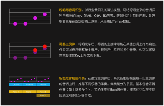 智曲通過行業(yè)最領先的技術算法,將哼唱出的音調(diào)識別至精準的key,哼唱完畢后得到的主旋律可對音符進行調(diào)整,同時可添加不同樂器的伴奏或音效,從而完成整個作曲過程。
