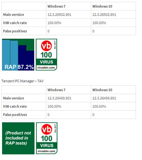 VB100測試以嚴(yán)苛的測試手段在業(yè)內(nèi)聞名,被譽(yù)為安全領(lǐng)域奧林匹克,通過測試殺毒軟件的病毒防護(hù)率和掃描速度,給予參測產(chǎn)品通過與不通過兩種測試結(jié)果。只有達(dá)到診斷率100%、誤診率0%時(shí),才有資格獲得VB 100%認(rèn)證標(biāo)志。本次測試延續(xù)了此前的雙系統(tǒng)測試模式,分別在Windows 7和Windows 10兩個(gè)系統(tǒng)環(huán)境中進(jìn)行,共有來自27家安全廠商的31款產(chǎn)品參測,其中也包括卡巴斯基、Bitdefender等國際老牌殺軟。最終,騰訊電腦管家(英文版)及其TAV版均以100%通過率,0誤報(bào)的成績通過測試。