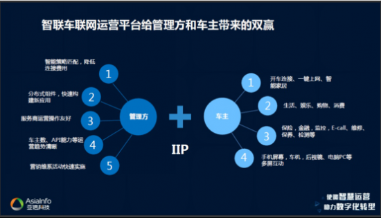 為了助力車聯網生態(tài)的建設,亞信科技創(chuàng)建了一款適配車聯網、具有行業(yè)特性的智聯車聯網運營平臺(Intelligence Internet Platform),通過多場景、多訴求,可為車企、車載設備商、TSP服務商、車聯網政企客戶提供不同程度的車聯網運營能力。一方面幫助車聯網客戶向車聯網運營商轉型,另一方面便于車主及時了解、保養(yǎng)車輛,方便出行。