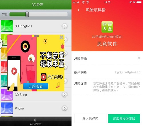 (圖:3D手機鈴聲大全軟件存惡意推廣風(fēng)險,騰訊手機管家已精準查殺)