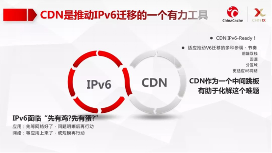 面臨IPv6的遷移改造,大家之前面臨更多的疑問是:先等網(wǎng)絡(luò)好了,問題明晰后再行動(dòng)?還是等應(yīng)用上來了,成規(guī)模再行動(dòng)?對(duì)于這個(gè)先有雞,還是先有蛋的問題,許會(huì)荃用CDN技術(shù)進(jìn)行了闡釋和化解:應(yīng)用改造需要網(wǎng)絡(luò)明確的部署,網(wǎng)絡(luò)的部署又需要應(yīng)用的規(guī)模性改造。CDN作為一個(gè)中間跳板,是推動(dòng)IPv6的有力工具,能夠極大的方便企業(yè)實(shí)現(xiàn)IPv6的遷移改造。其次,CDN能夠更有效的適應(yīng)IPv6變遷中的格局,能夠更有效的幫助用戶在遷移過程中減少損失、提高質(zhì)量、提高用戶黏度。