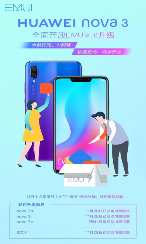 12月10日,華為EMUI給nova星人帶來心心念念的好消息,華為nova 3正式全面開放EMUI9.0系統(tǒng)。此外,nova 2s、nova 3i、nova 3e三款機(jī)型的升級進(jìn)度也隨之曝光。