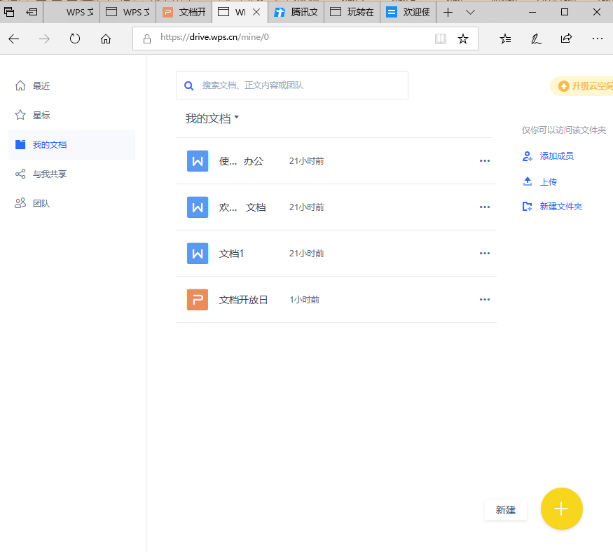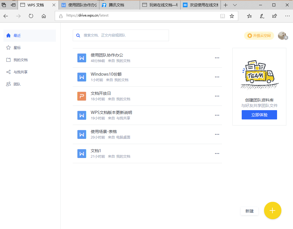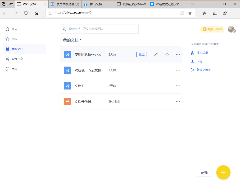 在WPS文檔主界面上,左側(cè)列出了大的分類功能,比如最常使用的最近、星標(biāo)文件、我的文檔、與我共享、團(tuán)隊等,中間區(qū)域就是內(nèi)容區(qū),通過列表、顏色圖標(biāo)、訪問時間等進(jìn)行排布,清晰自然。右側(cè)是上傳、新建文件夾等操作,右下角是快捷按鈕操作,黃色+十分醒目,不會造成困擾。