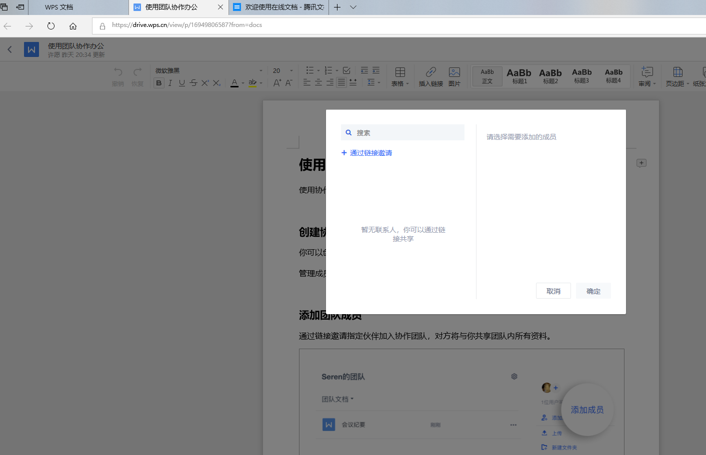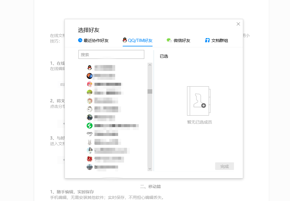 騰訊文檔的分享過程可能更加直觀自然,協(xié)作好友、QQ好友、微信好友、文檔群組都可以直接點擊直達(dá)。