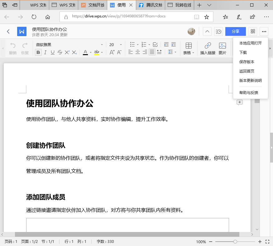 WPS文檔背靠著WPS套件可謂是占據(jù)了上風(fēng),也可以說WPS文檔就是WPS的在線協(xié)作版,其本身就有相互體現(xiàn)。比如在WPS文檔中,你可以選擇使用本地應(yīng)用打開,還有下載、保存版本等。