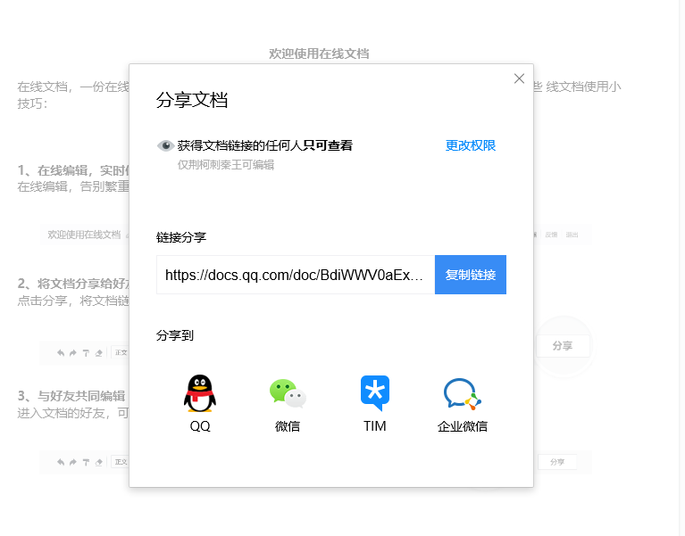 騰訊文檔的權(quán)限管理充分利用了社交網(wǎng)絡(luò)的屬性,可以和你的QQ好友、微信好友、同事群等分享文檔查看、編輯的權(quán)限。這對于使用相同辦公環(huán)境的同事或團(tuán)隊來說,的確是一個不錯的場景方式。