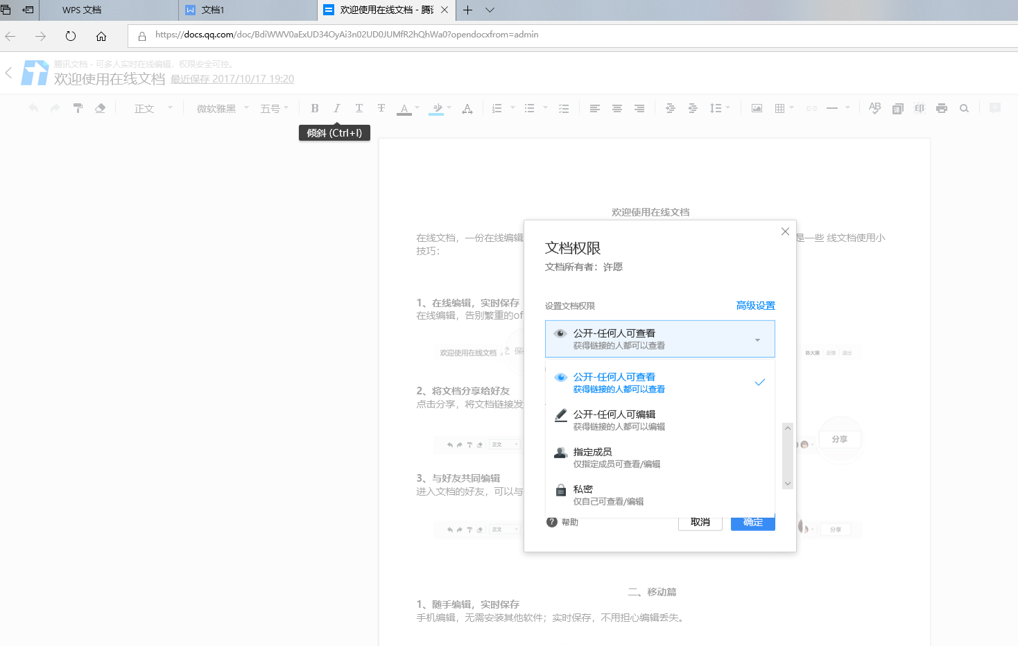 騰訊文檔界面采用了和WPS文檔相似的功能設(shè)計,但風(fēng)格稍顯不同,值得注意的是,騰訊文檔在右上角給出了明確的權(quán)限按鈕。