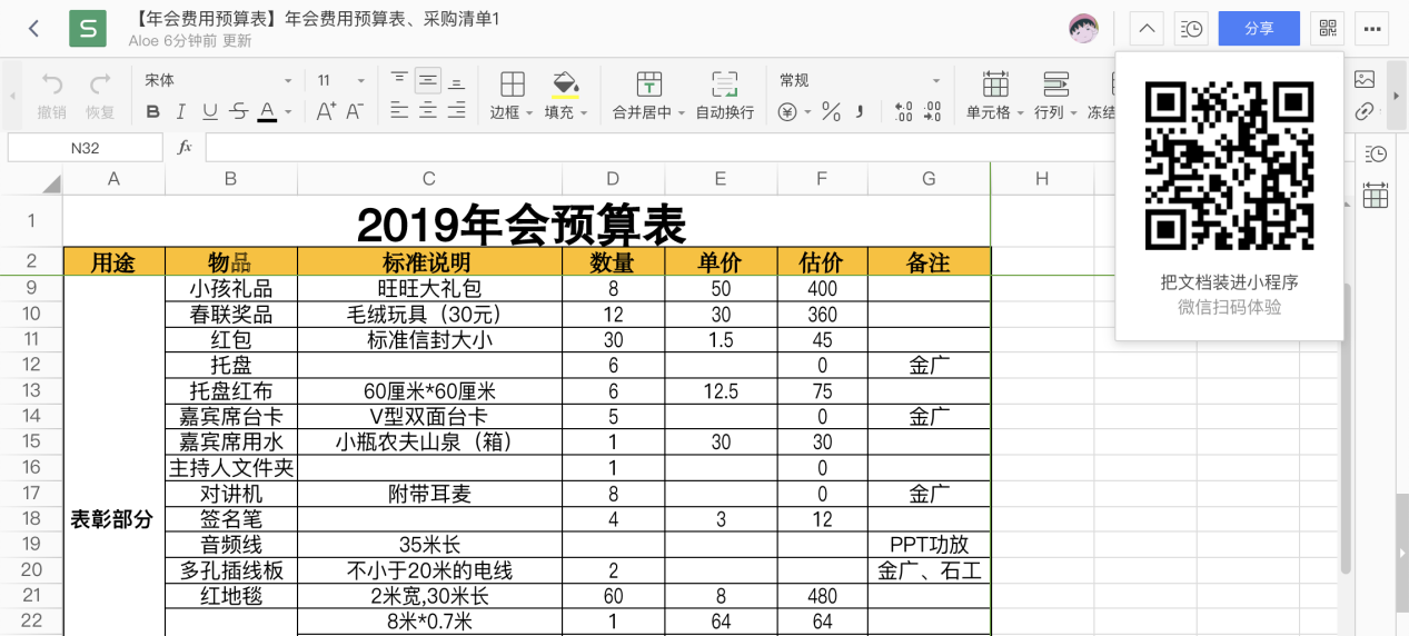 在具體操作區(qū)域,WPS文檔的上方顯示了基本的在線文檔功能區(qū),左上角是在線協(xié)作文檔的名稱、更新時間和最新修改者,右側(cè)是個人中心我、協(xié)作記錄、分享、二維碼(可把文檔裝進(jìn)小程序)、文檔打開下載保存版本等處理,看起來簡單易懂。