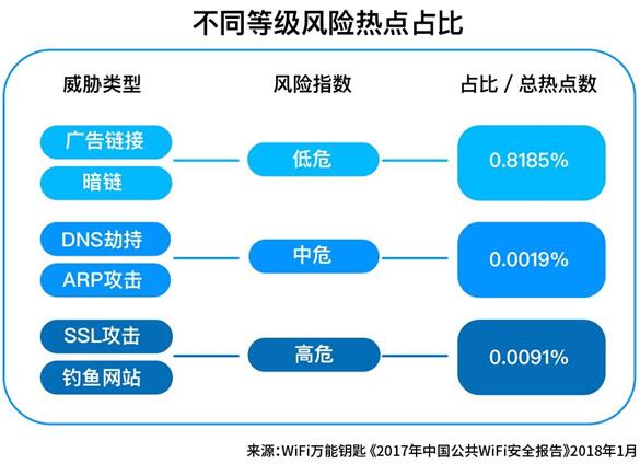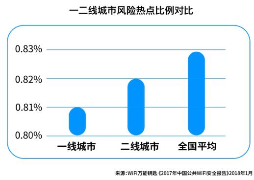 根據(jù)WiFi萬能鑰匙安全大數(shù)據(jù)統(tǒng)計,2017年全國風(fēng)險熱點數(shù)量占總熱點數(shù)量比例為0.8295%。盡管連接風(fēng)險熱點概率低,但由于連接公共WiFi的用戶基數(shù)大、頻次高,專家建議用戶謹(jǐn)慎對待,提高安全意識。