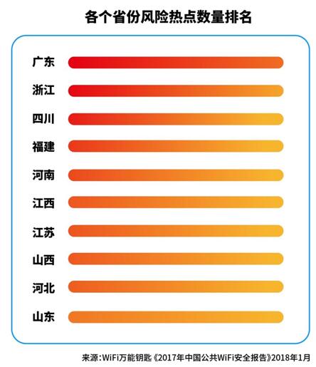 全國各省份中,廣東省的風(fēng)險熱點數(shù)量最多,其次是浙江省和四川省。值得注意的是,廣東省的WiFi熱點數(shù)占全國熱點總量比例也是最高。