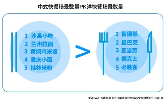 在餐飲美食場景中,快餐行業(yè)貢獻(xiàn)的WiFi場景占據(jù)較大比例。其中,沙縣小吃、蘭州拉面、黃燜雞米飯、重慶小面、桂林米粉等本土快餐的WiFi場景數(shù)量,比肯德基、星巴克、麥當(dāng)勞、德克士、必勝客等洋快餐更勝一籌。