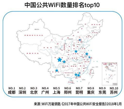 大數(shù)據(jù)顯示,中國WiFi數(shù)量排名top 20的城市分別為:成都、深圳、北京、廣州、上海、鄭州、昆明、重慶、東莞、蘇州、武漢、福州、西安、嘉興、佛山、杭州、天津、南京、長沙、南寧。