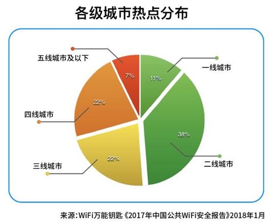 根據(jù)WiFi萬能鑰匙地域大數(shù)據(jù)顯示,在WiFi數(shù)量上,一二線城市明顯多于三四線城市,其中,成都、深圳、北京、廣州、上海位列中國城市WiFi熱點數(shù)量top 5;從風(fēng)險WiFi比例上看,風(fēng)險WiFi的比例卻遠(yuǎn)遠(yuǎn)低于三線以下城市。因此,不管是在數(shù)量上還是安全性上,一二線城市優(yōu)勢明顯。