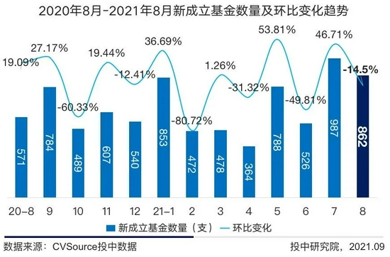 2021年8月新設(shè)基金環(huán)比下降14.5%,同比保持增長態(tài)勢,654家機(jī)構(gòu)參與新設(shè)基金;