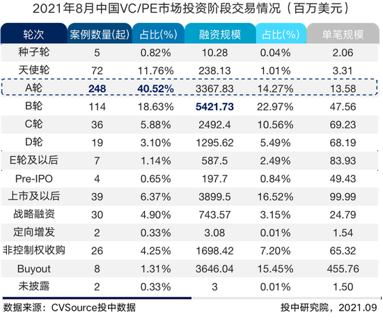 VC/PE投資輪次和地域情況本期A輪融資數(shù)量強(qiáng)勢回升至首位,占比超四成;B輪融資交易規(guī)模最大,達(dá)到54.22億美元。C輪及以后單筆規(guī)模環(huán)比均有不同程度上漲。
