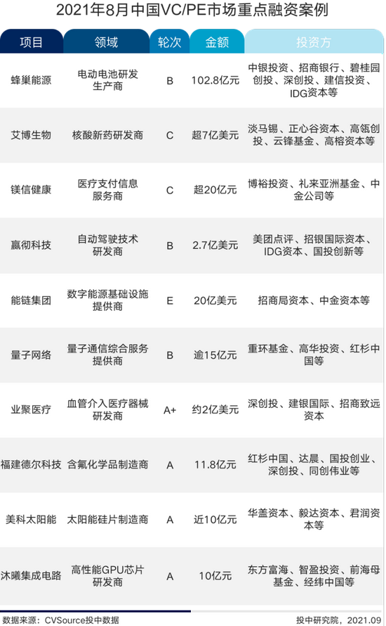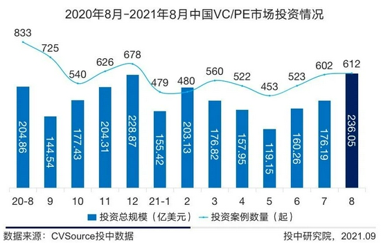 2021年8月,投資案例數(shù)量612起,環(huán)比微漲,同比下降36.11%;投資規(guī)模236.05億美元,環(huán)比提升25.36%,同比增加13.21%。
