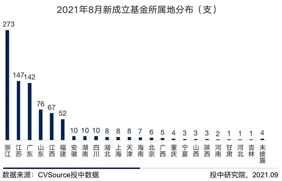 江蘇省新設(shè)基金數(shù)量逆勢上漲2021年8月,浙江省新設(shè)基金數(shù)量保持領(lǐng)先,達(dá)到273支,但受大環(huán)境影響,本期新設(shè)基金數(shù)量環(huán)比有所下降,降幅為13.06%。而位居第二位的江蘇省本期新設(shè)基金數(shù)量逆勢上漲,增加超10支。其余地區(qū)新設(shè)基金數(shù)量均有不同程度的回落。