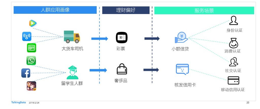 借助移動(dòng)應(yīng)用數(shù)據(jù),金融服務(wù)能夠精準(zhǔn)觸達(dá)大貨車(chē)司機(jī)、留學(xué)生等細(xì)分人群,圍繞應(yīng)用描繪人群理財(cái)偏好。線上數(shù)據(jù)的融入讓金融服務(wù)觸達(dá)的服務(wù)場(chǎng)景更加細(xì)化,金融普惠性得到提升。