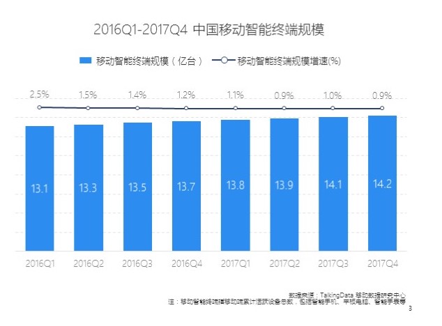 中國(guó)移動(dòng)智能終端設(shè)備規(guī)模季度增速放緩,自2016年第二季度起,移動(dòng)智能終端增速就跌破2%。移動(dòng)智能終端用戶(hù)規(guī)模步入低增速時(shí)代已有七個(gè)季度。