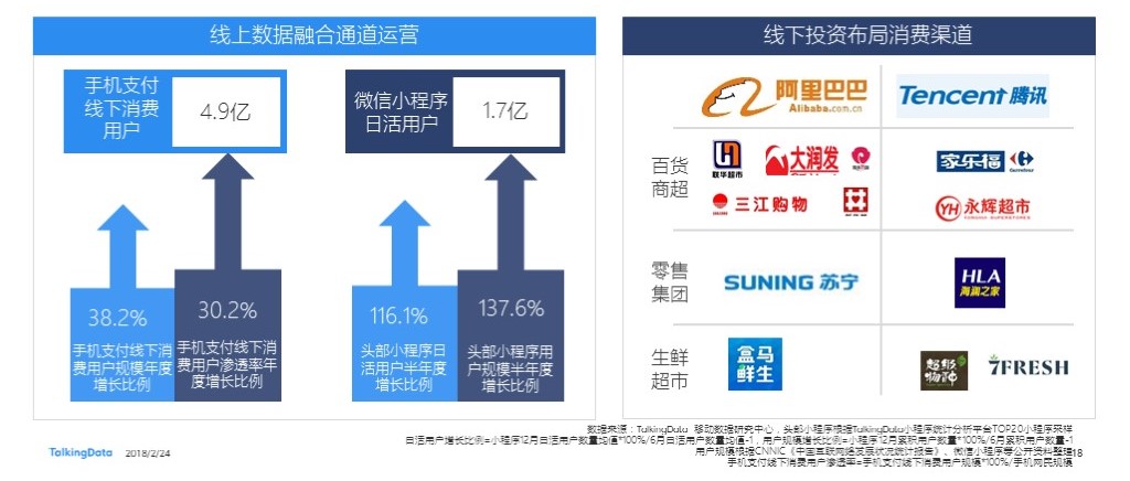 通過(guò)手機(jī)支付、微信小程序等數(shù)據(jù)融合工具的運(yùn)營(yíng),以及線下對(duì)百貨商超、零售集團(tuán)、生鮮超市等零售業(yè)態(tài)的投資布局,阿里巴巴與騰訊正在圍繞線下消費(fèi)打造數(shù)據(jù)融合生態(tài)。