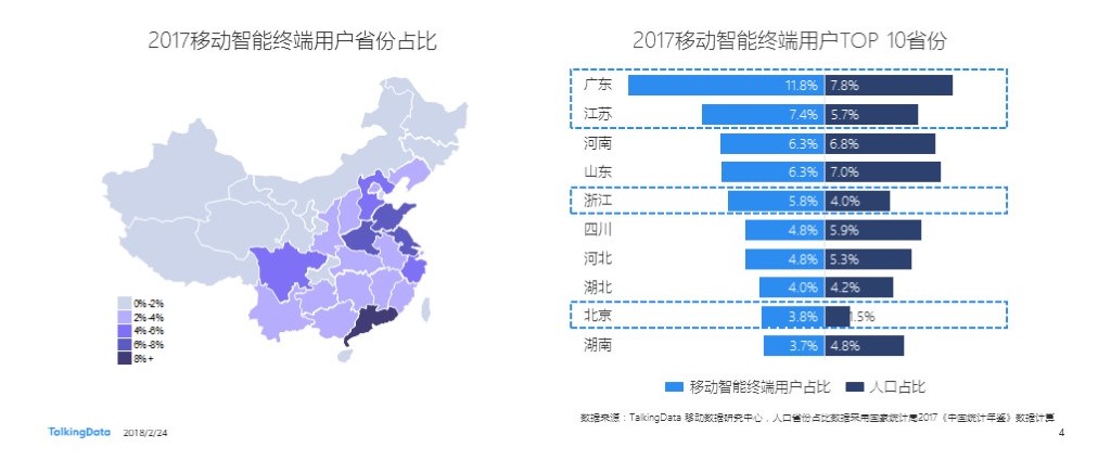 截至2017年12月,我國(guó)移動(dòng)智能終端用戶(hù)TOP10省份占據(jù)了整體近六成用戶(hù)。位居2017省市人均GDP排名前六位的北京、江蘇、浙江、廣東作為經(jīng)濟(jì)發(fā)達(dá)地區(qū),移動(dòng)智能終端用戶(hù)集中度更高,其智能終端用戶(hù)占比要高于人口占比,人才吸附能力更強(qiáng)。