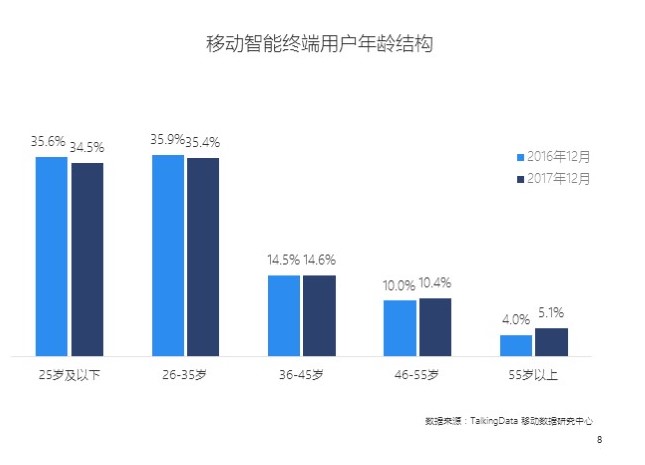 2017年,我國(guó)移動(dòng)智能終端用戶(hù)中35歲及以下用戶(hù)的比例達(dá)69.9%,年輕用戶(hù)仍然是移動(dòng)互聯(lián)網(wǎng)用戶(hù)的主體。