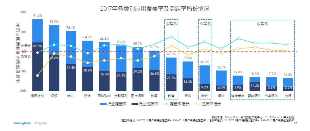 2017年,通訊社交、視頻、游戲等主流行業(yè)應(yīng)用活躍用戶(hù)規(guī)模增長(zhǎng)乏力,而教育、旅游、健康美容等行業(yè)類(lèi)別應(yīng)用覆蓋率及活躍率出現(xiàn)雙增長(zhǎng),行業(yè)潛力正在釋放。