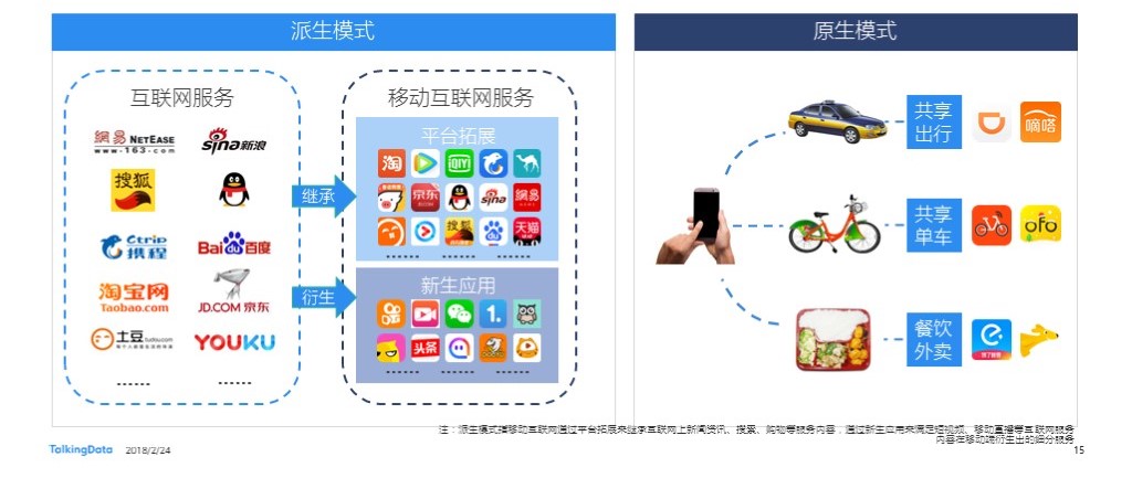 移動(dòng)互聯(lián)網(wǎng)已從派生模式發(fā)展到原生模式,相比于新聞資訊、搜索、視頻等派生模式服務(wù)內(nèi)容,原生模式對(duì)于線下資源的融合度更高,實(shí)體資源為服務(wù)商帶來(lái)更多的用戶(hù)流量與交互數(shù)據(jù)資產(chǎn)。