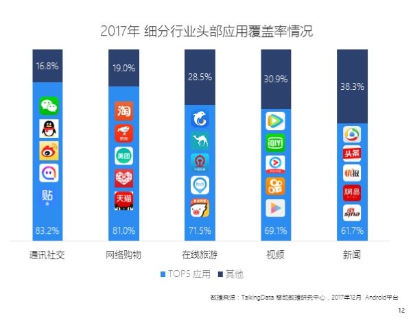 2017年,移動(dòng)互聯(lián)網(wǎng)頭部應(yīng)用覆蓋率領(lǐng)先優(yōu)勢(shì)明顯,細(xì)分行業(yè)中的TOP5應(yīng)用覆蓋了行業(yè)主流用戶(hù)。