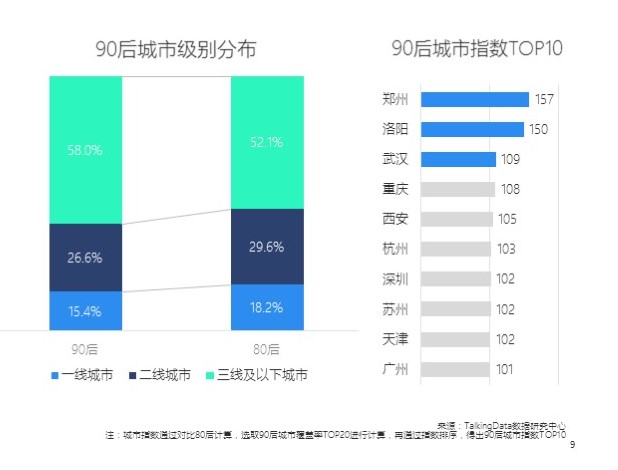 相比80后,90后人群城市層級(jí)分布中一線城市占比要更低。90后人群開(kāi)始逃離北上廣深,更多的選擇鄭州、武漢等區(qū)域中心城市作為個(gè)人發(fā)展的起點(diǎn)。