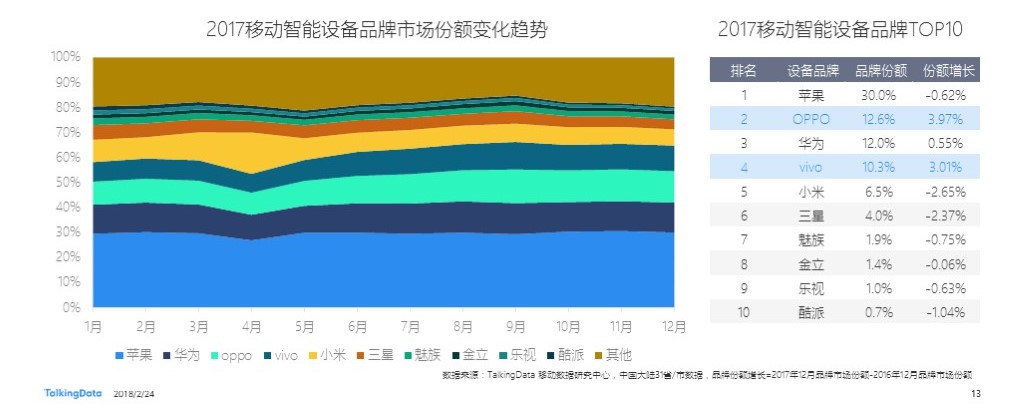 2017年表現(xiàn)最為亮眼的移動(dòng)智能設(shè)備品牌是主打線下渠道的OPPO與vivo,兩個(gè)品牌的市場(chǎng)份額分別從2016年12月份的8.6%、7.3%增長(zhǎng)至2017年12月份的12.6%、10.3%。