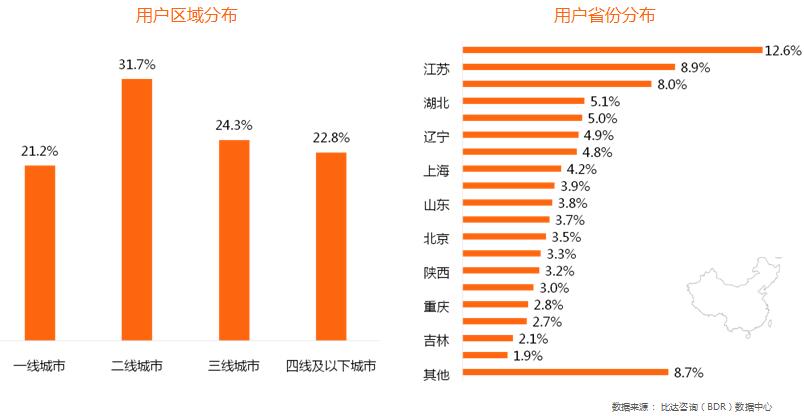 從移動醫(yī)療APP的用戶區(qū)域來看,二線城市用戶占比最高,達(dá)31.7%。一線城市占比21.2%,三線城市占比24.3%。