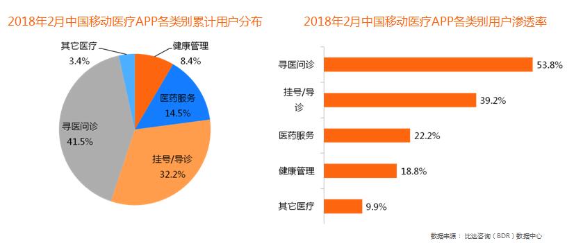 根據(jù)比達(dá)咨詢2018年2月的調(diào)查數(shù)據(jù)顯示,在中國移動醫(yī)療APP各細(xì)分類別用戶中,尋醫(yī)問診類APP的用戶使用率最高,高達(dá)41.5%,健康管理類APP的用戶使用率最低,為8.4%。在中國移動醫(yī)療APP各類別用戶滲透率中,尋醫(yī)問診類APP仍然占比最高,達(dá)53.8%。