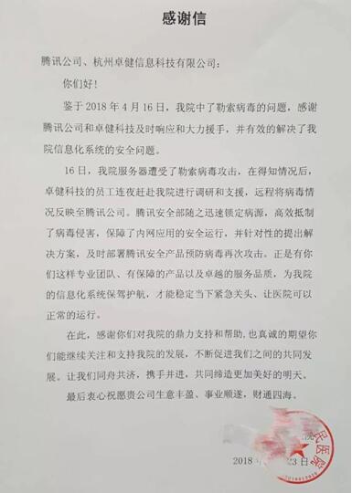 2018年4月16日,國內某醫(yī)院的服務器遭受勒索病毒攻擊,騰訊企業(yè)安全了解情況后聯(lián)合杭州卓健信息科技有限公司對該醫(yī)院連夜進行調研和支持,成功抵御了病毒侵害,同時部署產品騰訊御點,預防病毒再次攻擊。近日,醫(yī)院致信向騰訊企業(yè)安全和卓健科技表示感謝。