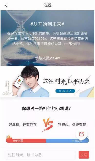 4月12日,在掌閱App端發(fā)起從開始 到未來的話題討論,征集粉絲在討論區(qū)寫下和王俊凱的故事,當(dāng)總留言超過9210條時(shí),將篩選精彩故事集結(jié)成冊(cè)送給王俊凱。該活動(dòng)通過引導(dǎo)粉絲書寫與偶像相關(guān)的成長(zhǎng)故事,在年輕人中傳遞激勵(lì)成長(zhǎng)的正能量。